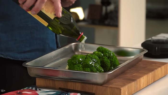 Брокколи выкладываем на лоток для запекания, поливаем оливковым маслом, присаливаем, перчим. -