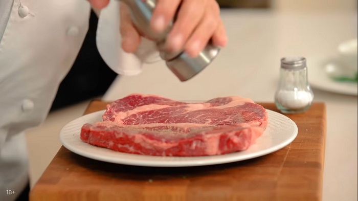 Стейки присаливаем и перчим с двух сторон, а также слегка поливаем оливковым маслом. -