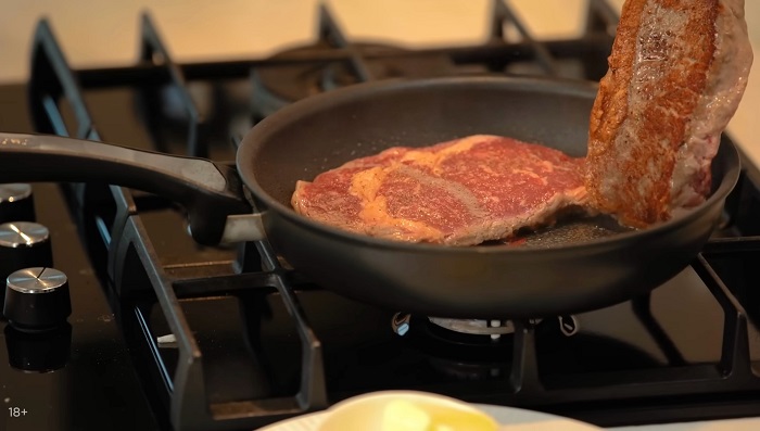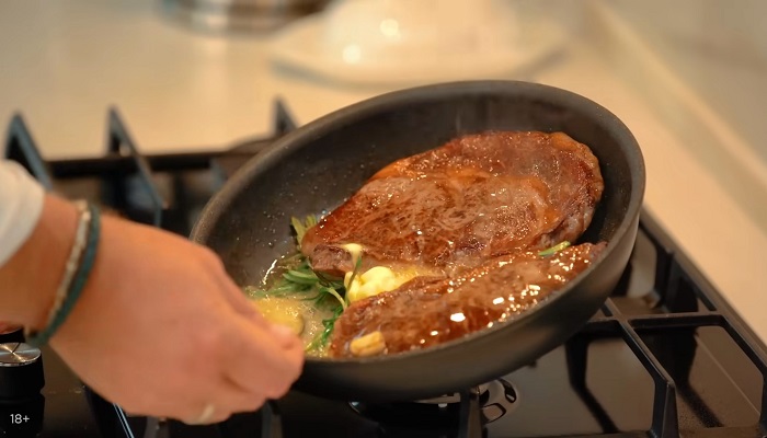 Начинаем прижаривать мясо на сухой сковороде, а затем забрасываем к нему пару зубчиков чеснока, веточку розмарина и хороший кусок сливочного масла, этим маслом, хорошо обливаем стейки, мясо должно хорошо пропитаться им. -