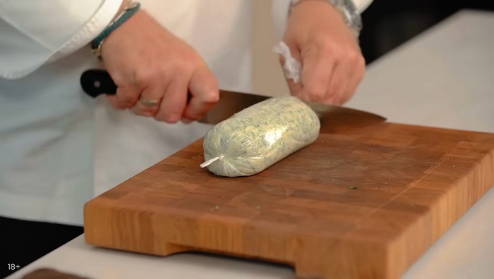 Пищевую пленку разворачиваем на доске, на нее укладываем пикантное масло, заворачиваем его в "колбаску", убираем ее в холодильник. -