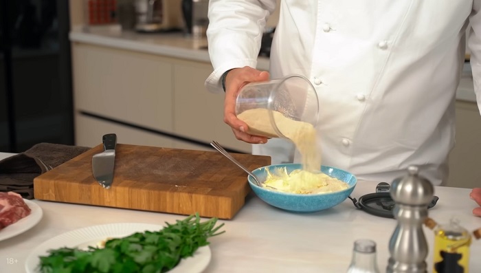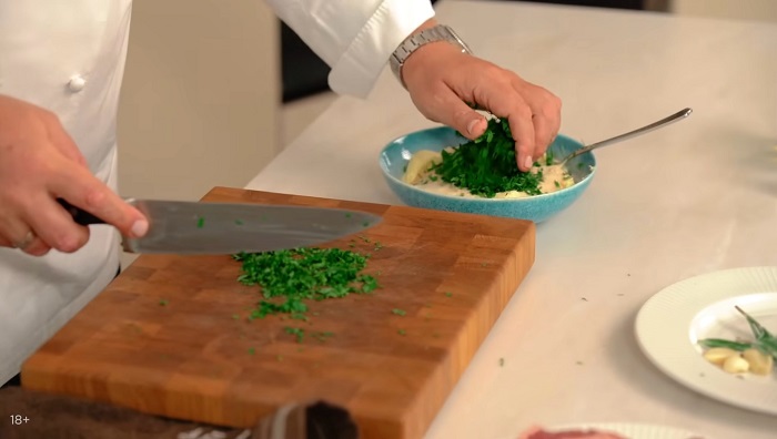 Сливочное масло комнатной температуры солим, добавляем в него раздавленный чеснок, панировочные сухари, мелко нарезанный розмарин и петрушку, перемешиваем. -