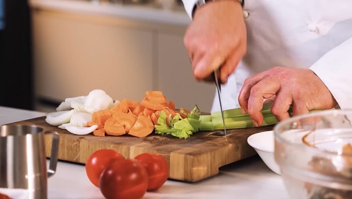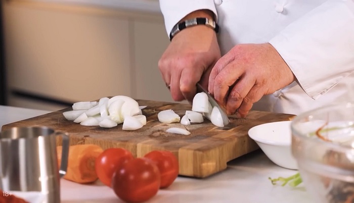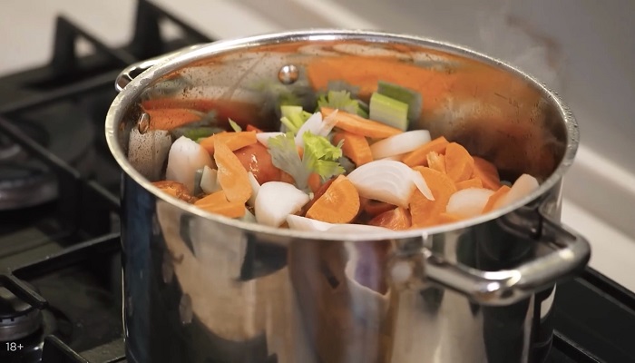 Овощи (лук, морковь, сельдерей и помидоры) нарезаем произвольно, забрасываем их сверху панцирей, но не мешаем. -