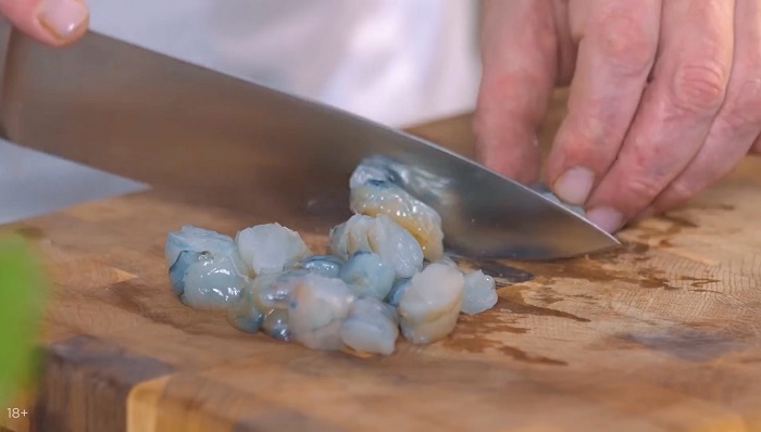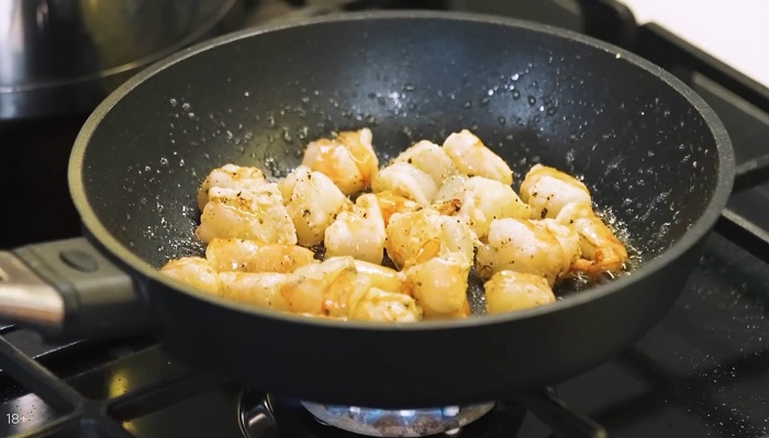 Креветки очищаем, нарезаем средним кубиком, обжариваем на оливковом масле с добавлением соли и перца. -