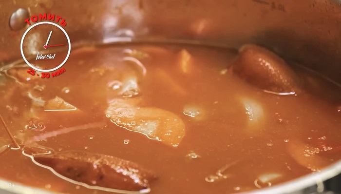 Вводим томатную пасту, перемешиваем и пассируем в течение 5 минут. -