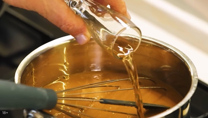Вводим в суп коньяк, выпариваем, вводим сливки, добавляем соли, перца и немного сахара, доводим до кипения и провариваем еще пару минут. -