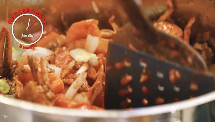 В кастрюле на растительном масле начинаем прижаривать раковые панцири. -