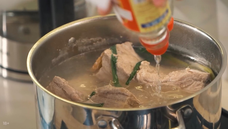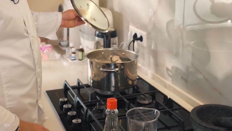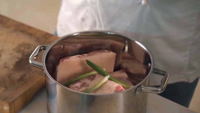 Грудинку закладываем в кастрюлю, туда же кладем стебли зелёного лука, измельчённый чеснок и корень имбиря. Заливаем водой, ставим на средний огонь на 40 минут. -