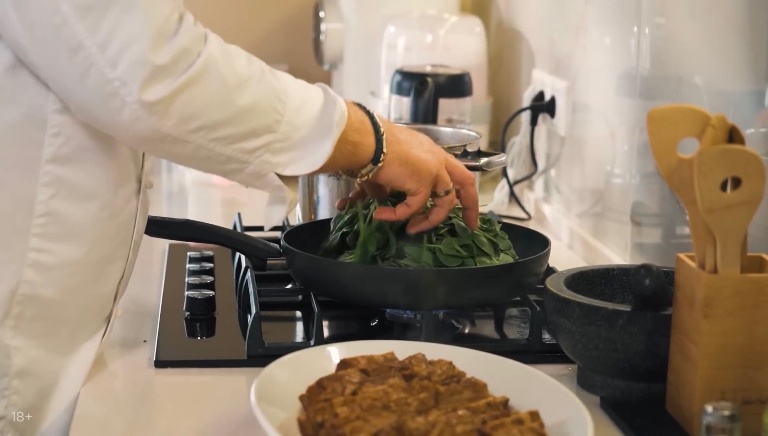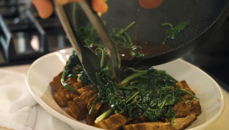 Мясо достаём, а в оставшемся соусе обжариваем шпинат и зелёный лук. -