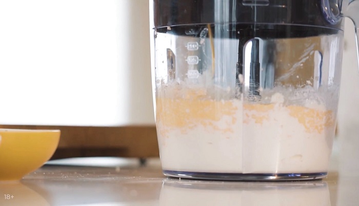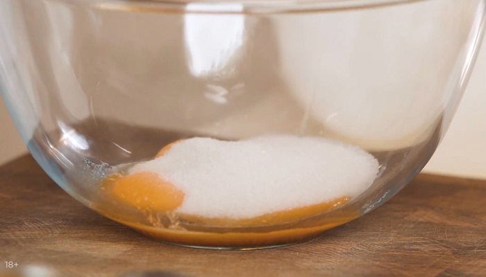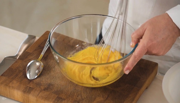 Белки отделяем от желтков, к желткам добавляем сахар и немного мангового пюре, взбиваем венчиком до полного растворения сахара. -