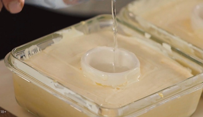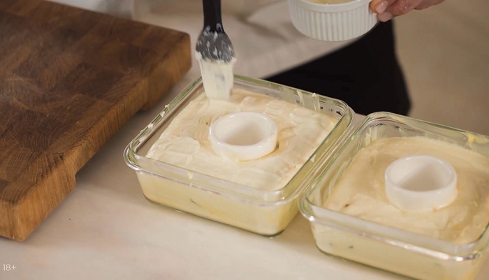 Смазываем форму для запекания куском сливочного масла и равномерно выкладываем в нее "тесто", делаем в нем небольшое углубление с помощью чашечек для яиц, оставляем их в "тесте" и вливаем в них немного воды. -