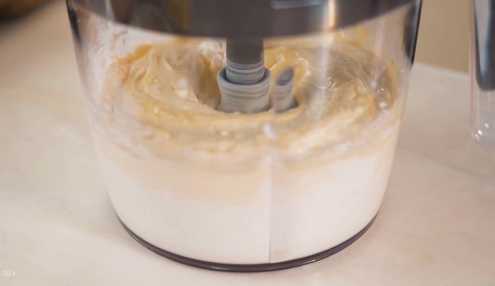 В блендер закладываем творог, добавляем соли и ложку сметаны, пробиваем до однородности. -