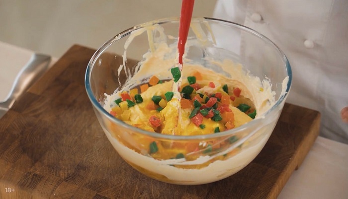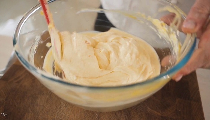 Слегка подбиваем белки и вводим их в творожную массу, перемешиваем. -