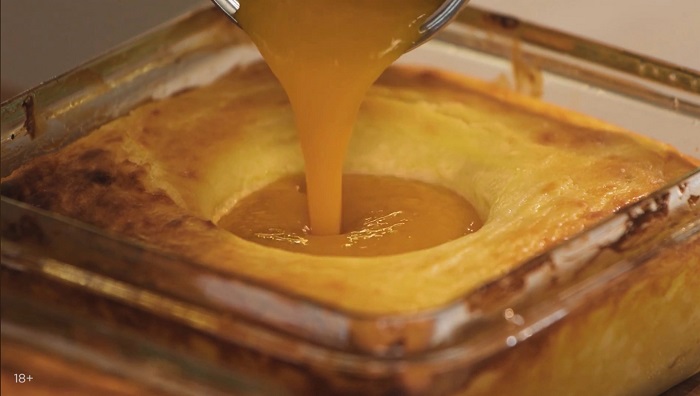 Смазываем запеканку растопленным сливочным маслом и даем постоять 15 минут, а затем убираем формочки, а в отверстия выкладываем манговое пюре. Вот такая воздушная, нежная и вкусная творожная запеканка по-Ивлевски у нас получилась!