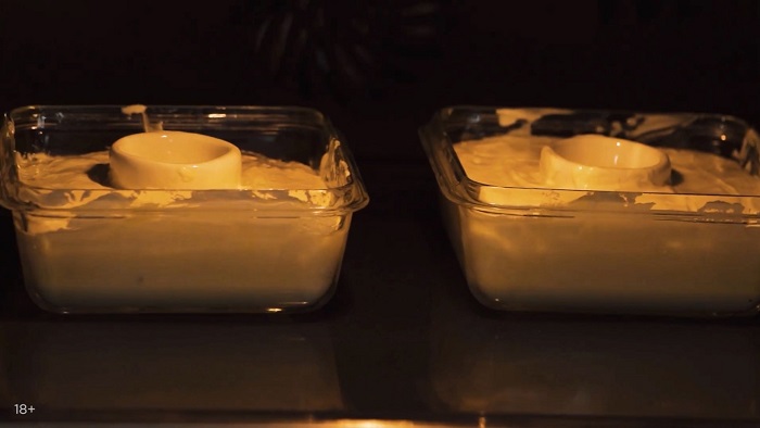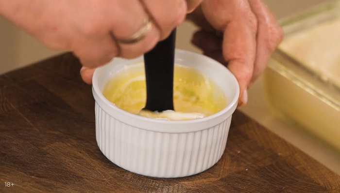 Смешиваем растопленное сливочное масло и немного сметаны, смазываем запеканку. Отправляем все это дело в духовку на 20 минут при 180 градусах. -