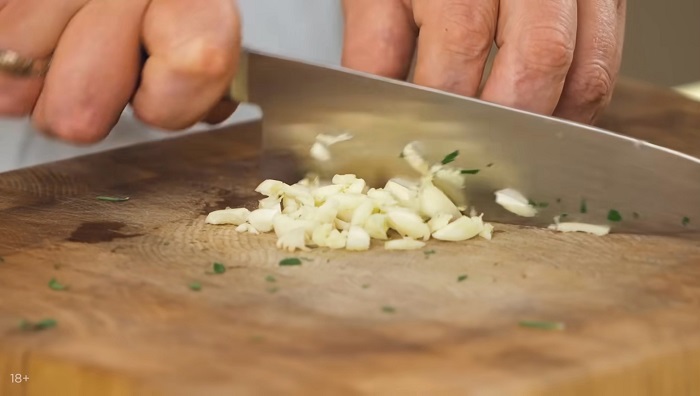 Мясо (лучше оставить в фольге) перекладываем в большое блюдо, посыпаем сверху свежим розмарином, петрушкой и мелко нарезанным чесноком. -