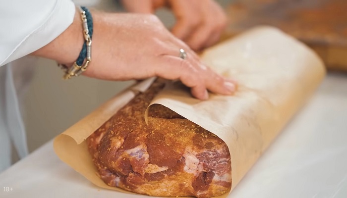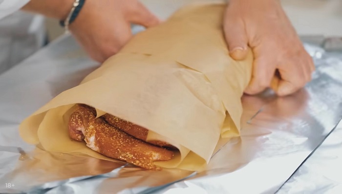 Плотно закрываем мясо пергаментом со всех сторон, а затем фольгой. -