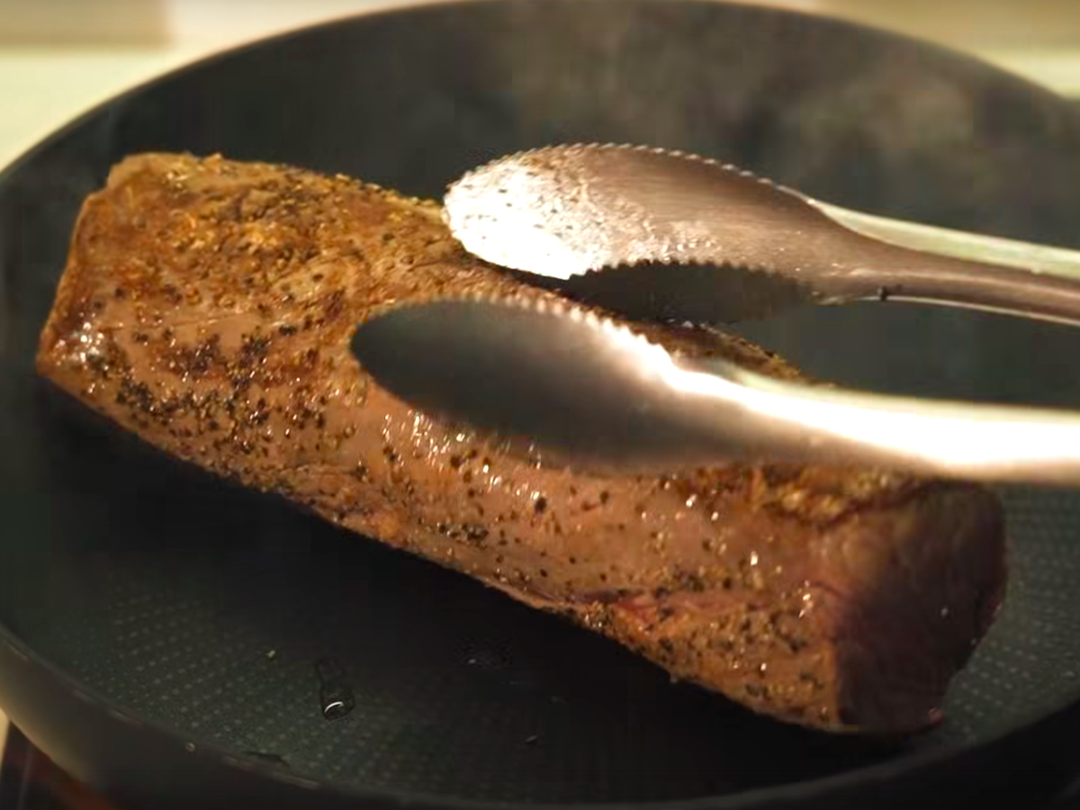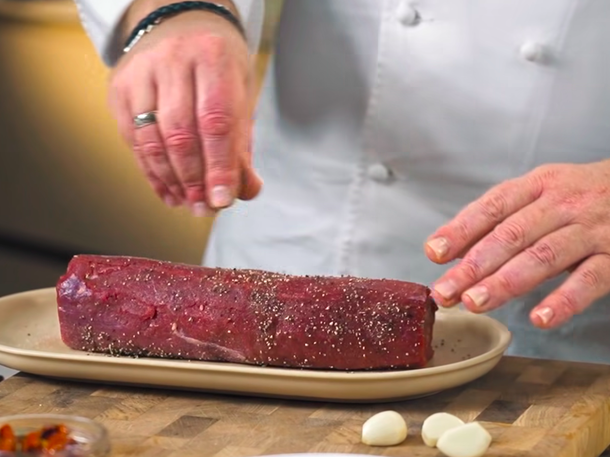 Приправьте вырезку солью и перцем. Обжарьте ее на сильно разогретой сковороде на оливковом масле со всех сторон до золотистой корочки. -
