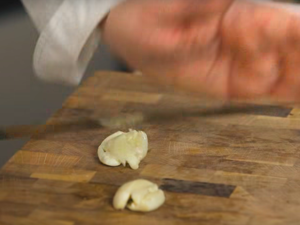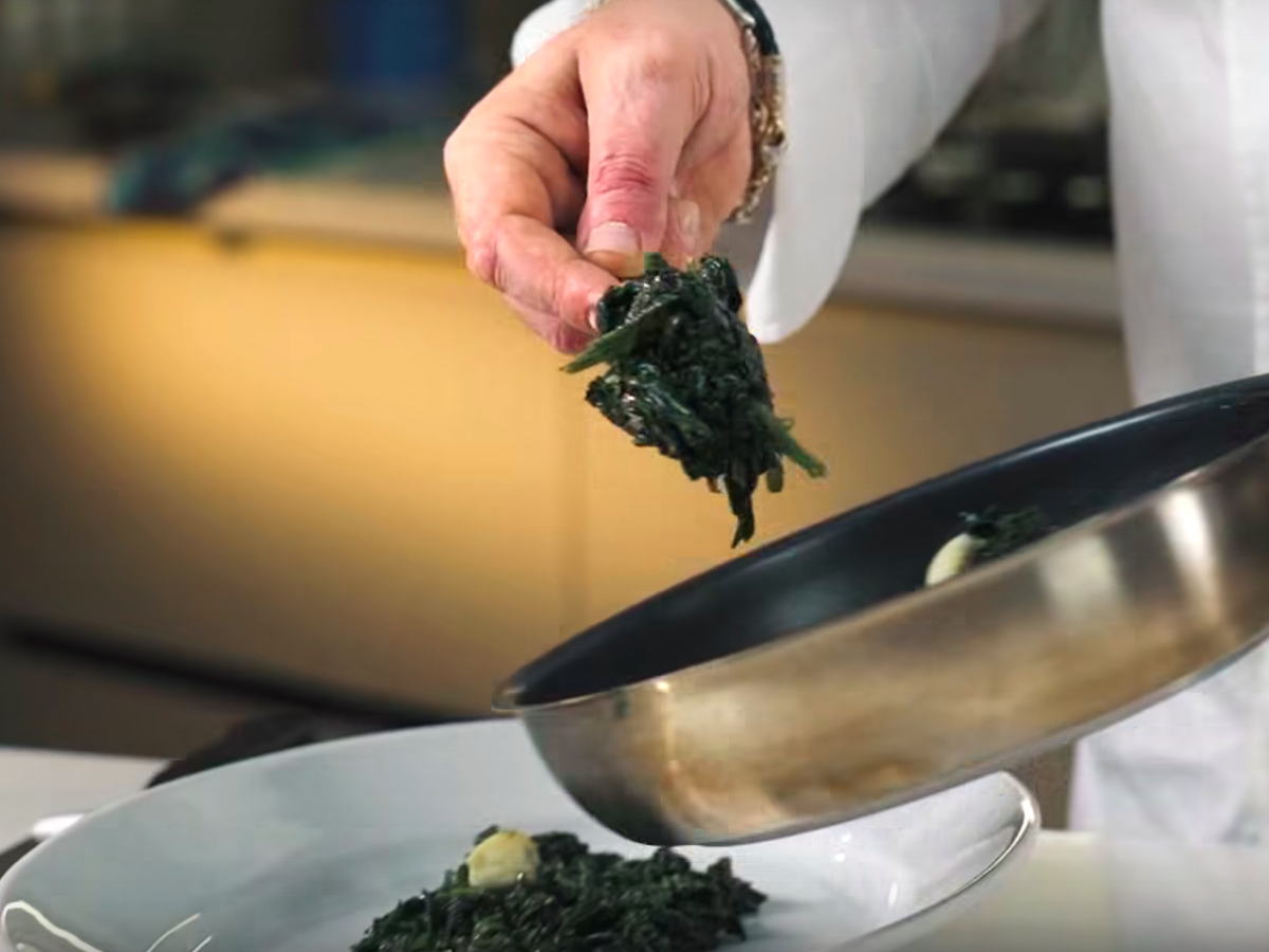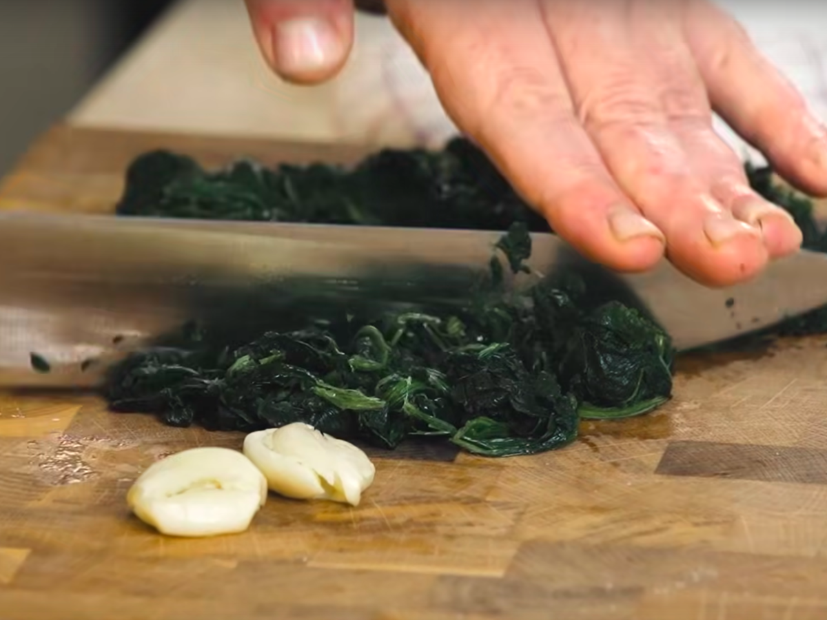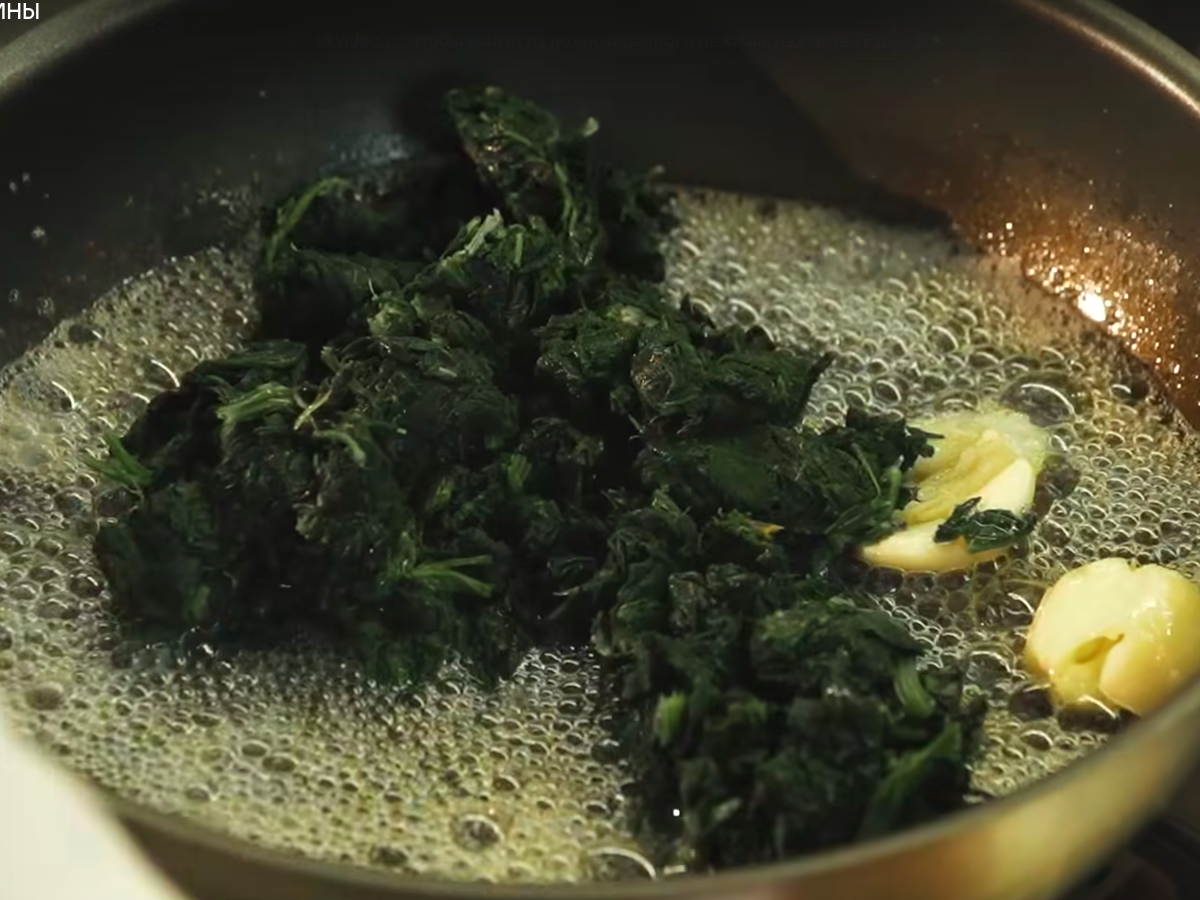 Подготовьте основу: раздавите зубчики чеснока и мелко порубите свежий шпинат. Растопите сливочное масло на сковороде. Быстро обжарьте чеснок, чтобы он отдал свой аромат, но не стал горьким. Добавьте к чесноку шпинат, приправьте солью и перцем, затем снимите сковороду с плиты. -