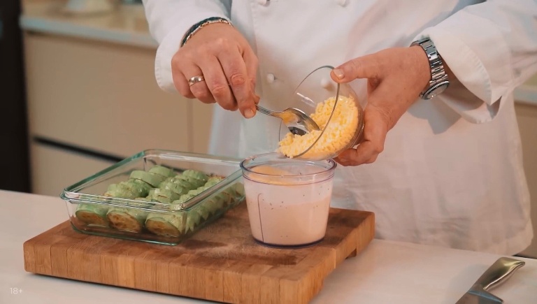 Тертый сыр мы добавим к соусу и перемешаем, затем покроем соусом наши кабачки. -