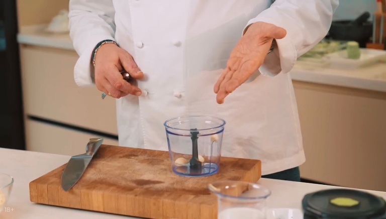 Приготовим соус, для этого в блендере нужно пробить чеснок, петрушку, залитые сливками, с кориандром, паприкой, солью, перцем и томатной пастой. -