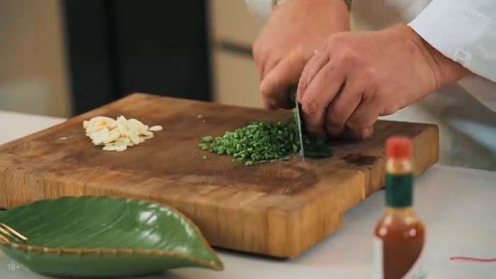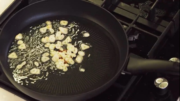 В разогретую сковородку вливаем столько оливкового масла, чтобы оно покрыло дно сковородки, забрасываем чеснок и прижариваем секунд 10. -
