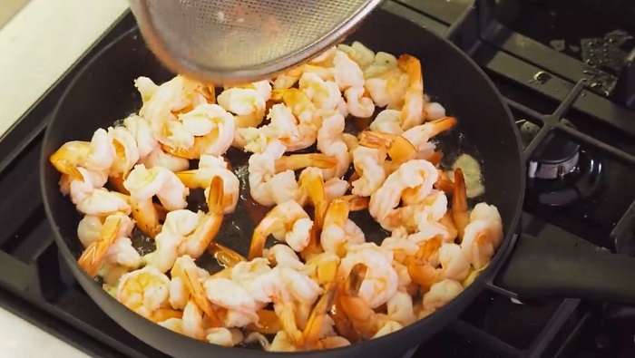 Забрасываем в сковороду креветки, солим, перчим, добавляем табаско и вводим стебли петрушки, жарим в течение 1,5 минуты. -