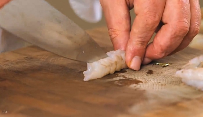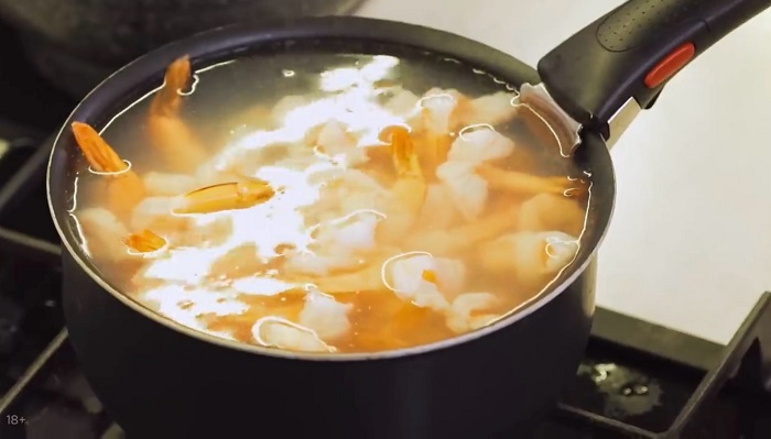 Очищенные креветки подрезаем на хвостике, опускаем в кипящую воду на 30 сек - 1 мин, а затем откидываем на дуршлаг под холодную воду. -