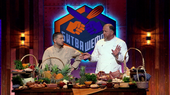 Константин Ивлев и Ренат Агзамов начинают новую битву шефов! Они выберут поваров для своих команд и проверят, чья кулинарная интуиция на этот раз сработает лучше. Участники должны будут приготовить классический курник, отгадать рецепт фаршированных кнедликов и картофельных шишек, а также придумать блюдо с ананасом. Кто справится со всеми заданиями и приведёт своего наставника к победе, покажет программа «Битва шефов».